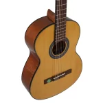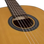 Esta guitarra cuenta con una tapa de abeto europeo sólido que proporciona un tono brillante y resonante, mientras que el fondo y los aros de okume aportan calidez y equilibrio al sonido.